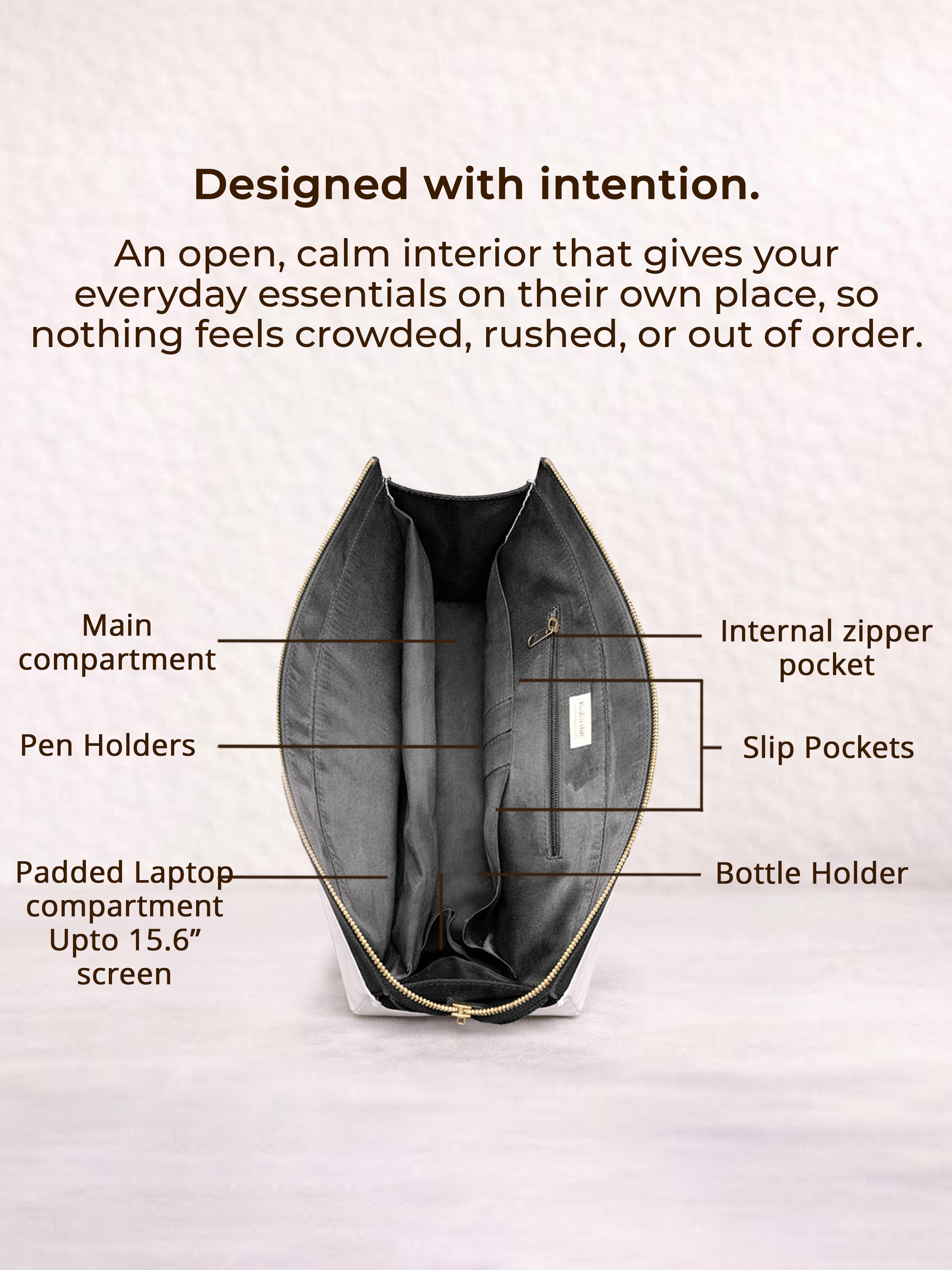 Introducing Kalankit Office Tote Bag for Women: Designed for modern work routines, this office bag for women combines practical storage with a clean, professional aesthetic. With a spacious structure measuring 41 x 11 x 34 cm, it offers ample room for daily essentials, making it an ideal tote bag for women office use and a reliable work bag for professional settings. The interior features a padded laptop sleeve to safely carry work devices, along with a dedicated bottle holder and organized compartments that help keep belongings neatly arranged throughout the day. Crafted from durable black canvas fabric, the bag is built for everyday use while maintaining a minimal, modern look suited for office environments. A secure zip closure keeps items protected during commutes, while comfortable handles allow effortless hand or shoulder carry. Lightweight yet structured, this stylish office bag fits seamlessly into daily work life, office commutes, and professional travel—making it a dependable everyday companion.