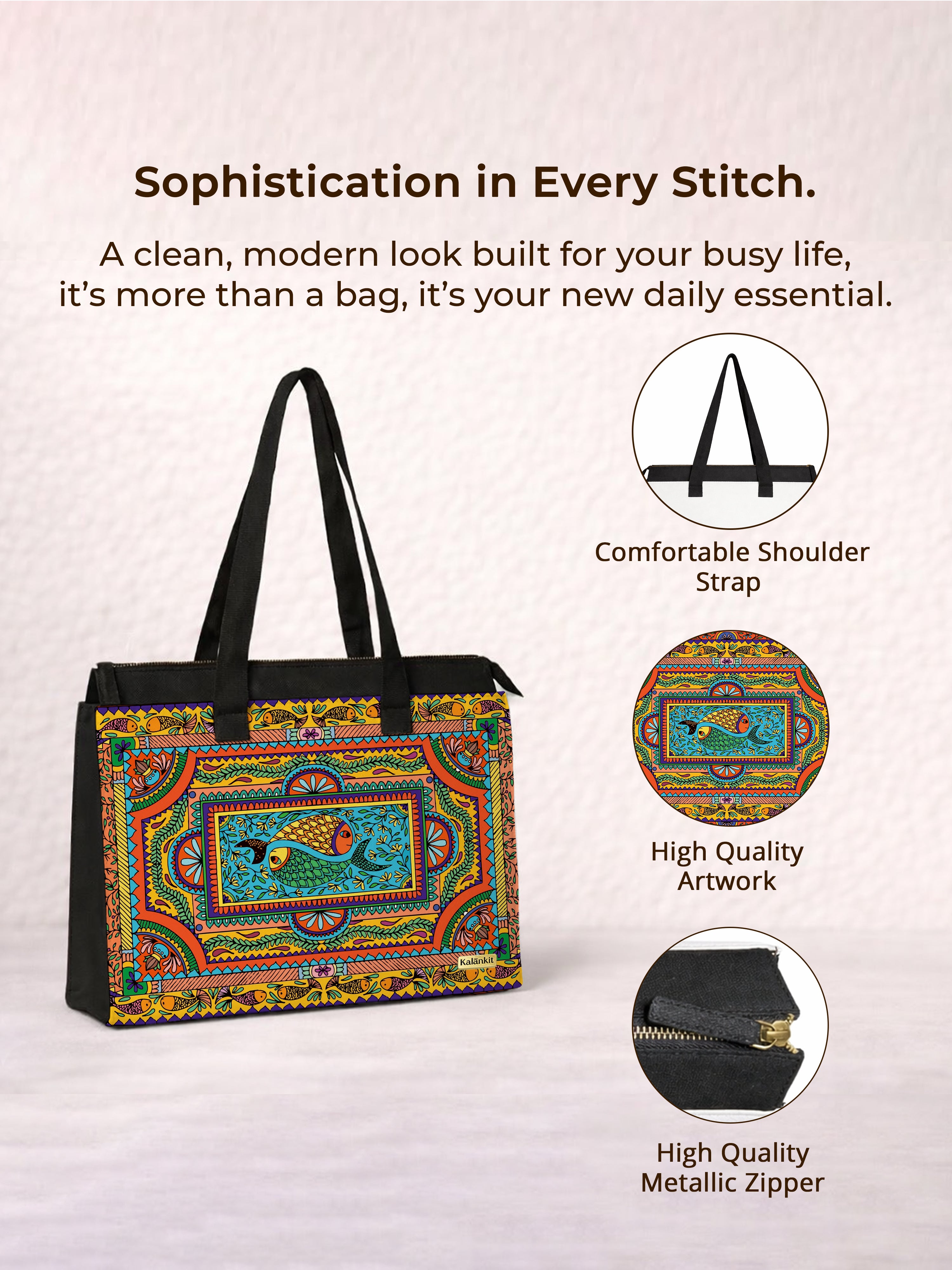 Introducing Kalankit Office Tote Bag for Women: Designed for modern work routines, this office bag for women combines practical storage with a clean, professional aesthetic. With a spacious structure measuring 41 x 11 x 34 cm, it offers ample room for daily essentials, making it an ideal tote bag for women office use and a reliable work bag for professional settings. The interior features a padded laptop sleeve to safely carry work devices, along with a dedicated bottle holder and organized compartments that help keep belongings neatly arranged throughout the day. Crafted from durable black canvas fabric, the bag is built for everyday use while maintaining a minimal, modern look suited for office environments. A secure zip closure keeps items protected during commutes, while comfortable handles allow effortless hand or shoulder carry. Lightweight yet structured, this stylish office bag fits seamlessly into daily work life, office commutes, and professional travel—making it a dependable everyday companion.