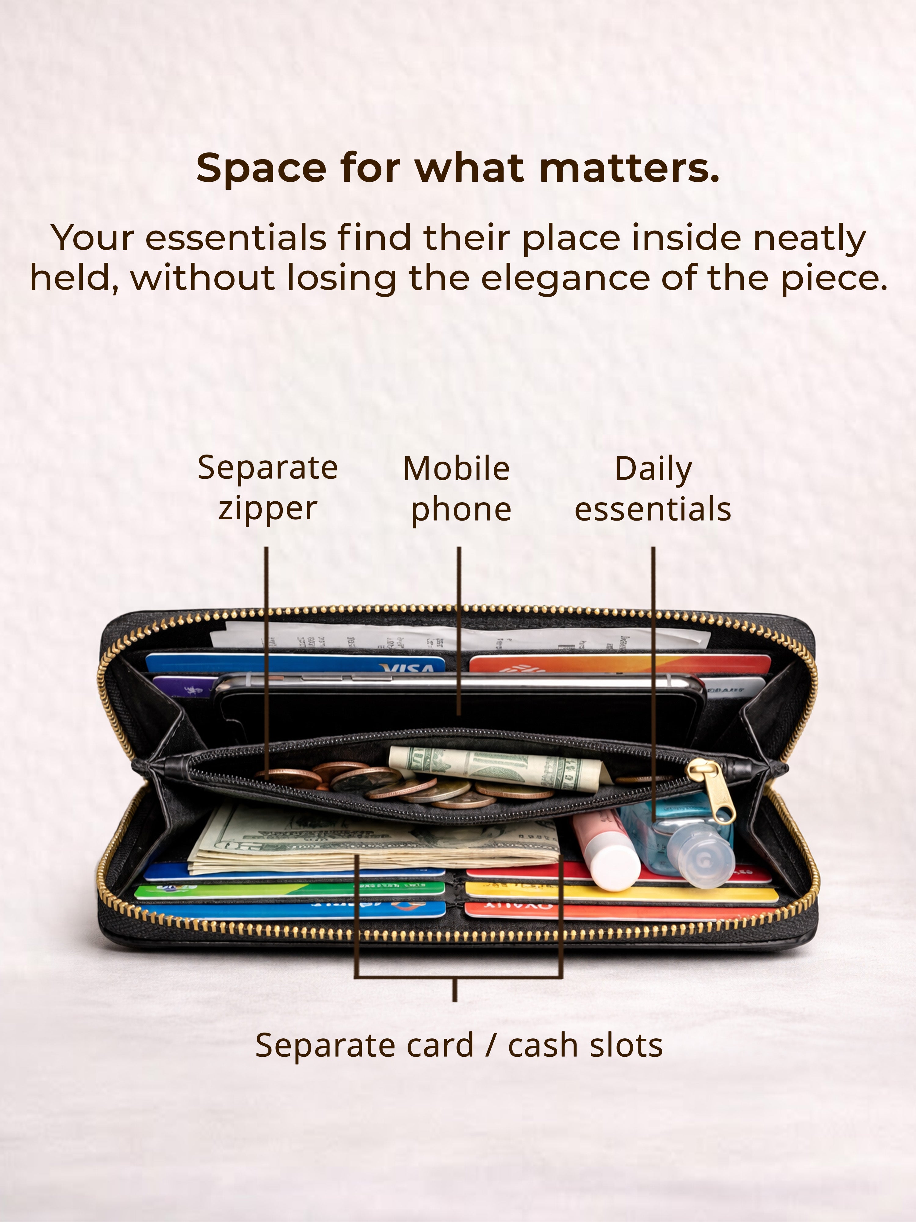 • Inside Storage: Multiple Card Slots, Spacious Cash Compartments, and a Center Zipper Pocket for Coins with Secure Zip Closure