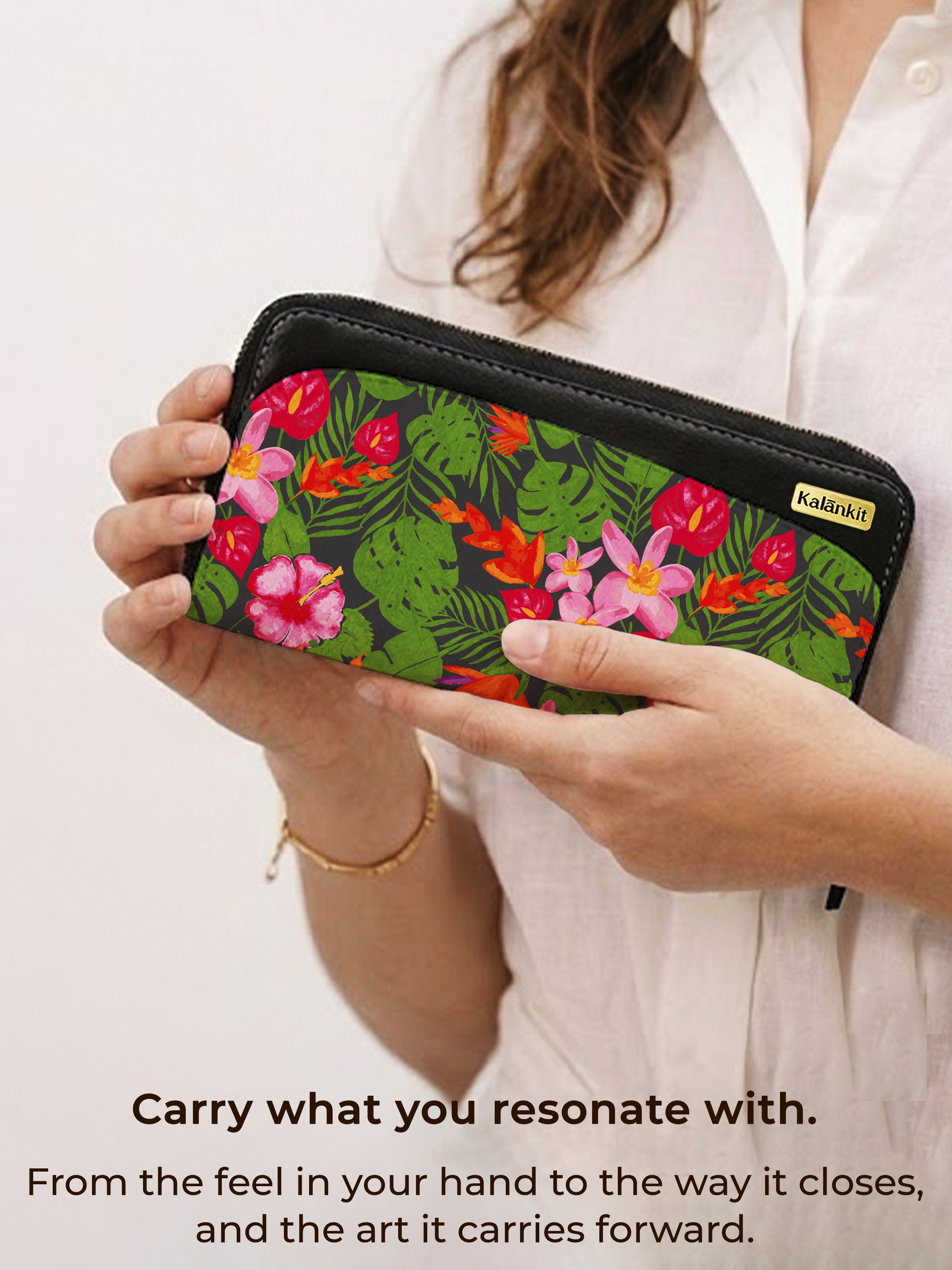 About the Artwork: A vibrant fusion of hibiscus blooms and rainforest greens—this artwork channels the spirit of sun-soaked escapes and the wild charm of untamed nature.