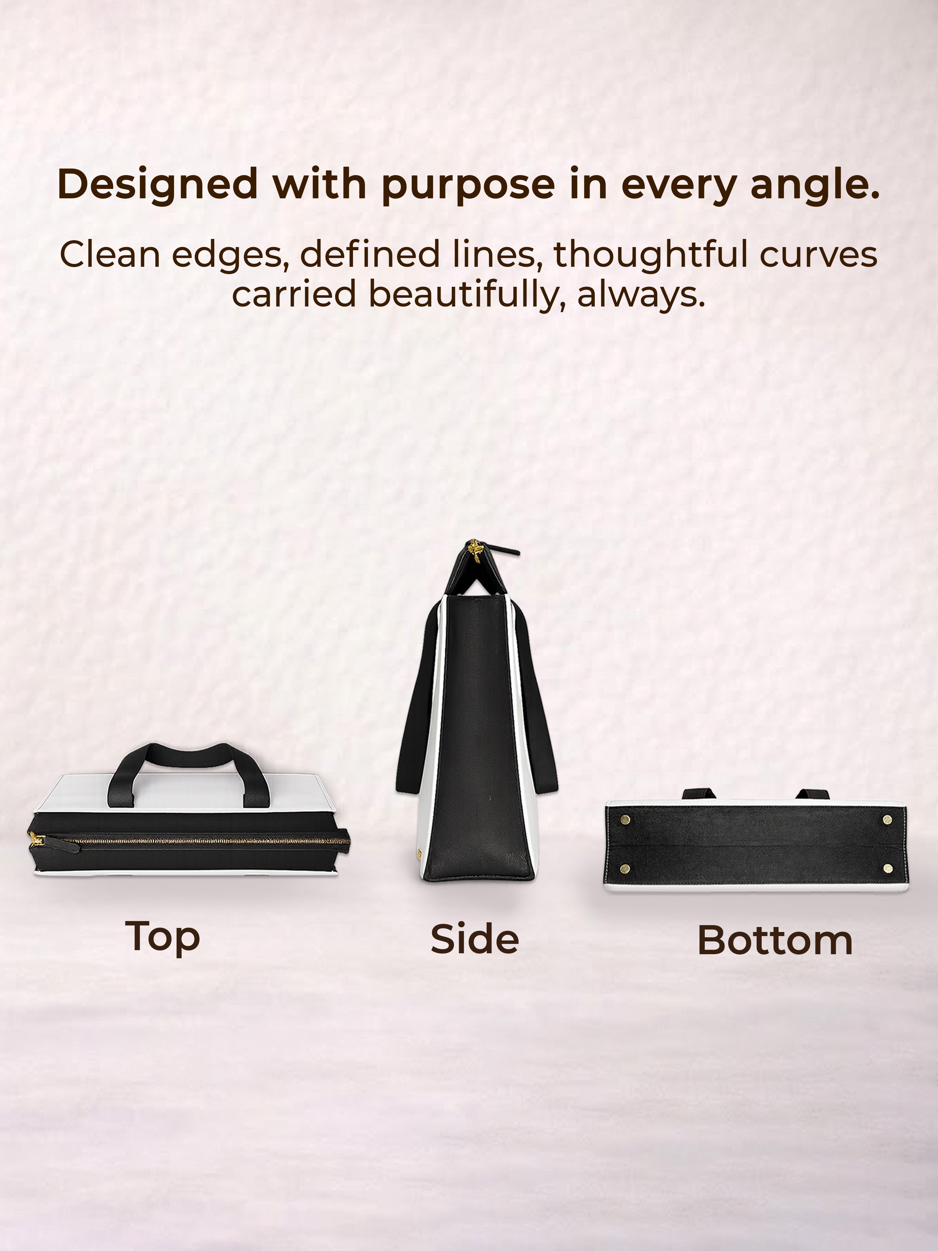 Introducing Kalankit Office Tote Bag for Women: Designed for modern work routines, this office bag for women combines practical storage with a clean, professional aesthetic. With a spacious structure measuring 41 x 11 x 34 cm, it offers ample room for daily essentials, making it an ideal tote bag for women office use and a reliable work bag for professional settings. The interior features a padded laptop sleeve to safely carry work devices, along with a dedicated bottle holder and organized compartments that help keep belongings neatly arranged throughout the day. Crafted from durable black canvas fabric, the bag is built for everyday use while maintaining a minimal, modern look suited for office environments. A secure zip closure keeps items protected during commutes, while comfortable handles allow effortless hand or shoulder carry. Lightweight yet structured, this stylish office bag fits seamlessly into daily work life, office commutes, and professional travel—making it a dependable everyday companion.