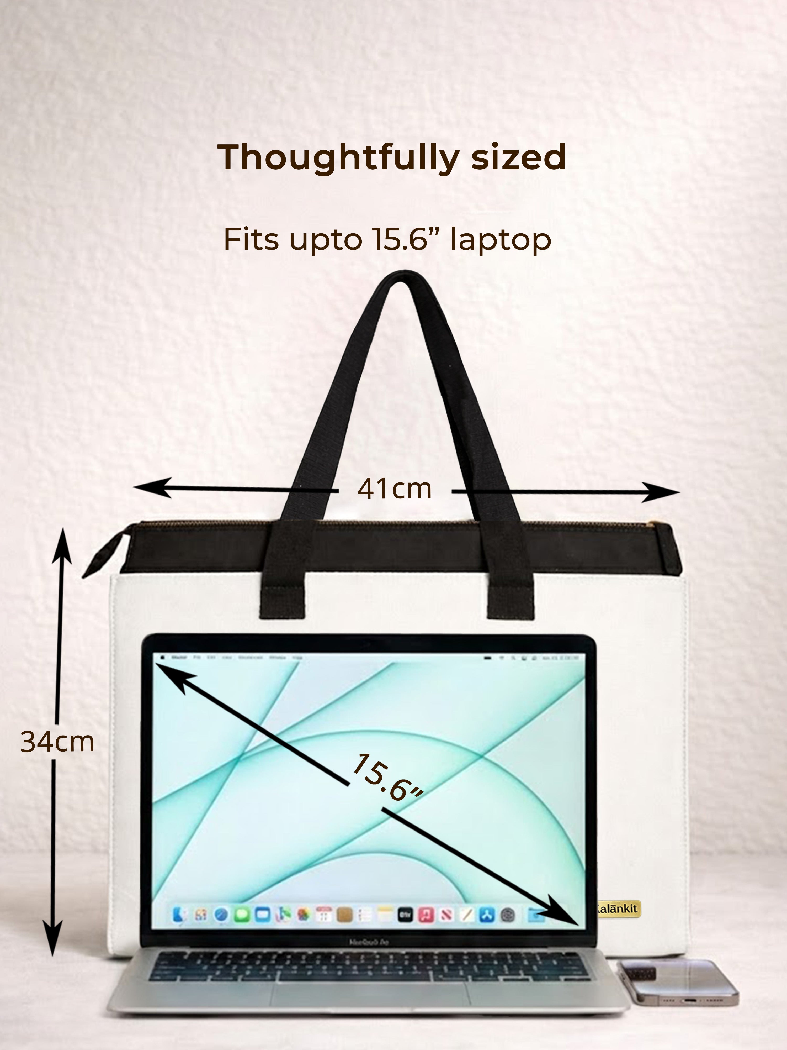 Introducing Kalankit Office Tote Bag for Women: Designed for modern work routines, this office bag for women combines practical storage with a clean, professional aesthetic. With a spacious structure measuring 41 x 11 x 34 cm, it offers ample room for daily essentials, making it an ideal tote bag for women office use and a reliable work bag for professional settings. The interior features a padded laptop sleeve to safely carry work devices, along with a dedicated bottle holder and organized compartments that help keep belongings neatly arranged throughout the day. Crafted from durable black canvas fabric, the bag is built for everyday use while maintaining a minimal, modern look suited for office environments. A secure zip closure keeps items protected during commutes, while comfortable handles allow effortless hand or shoulder carry. Lightweight yet structured, this stylish office bag fits seamlessly into daily work life, office commutes, and professional travel—making it a dependable everyday companion.